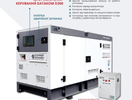 Управление всеми рабочими процессами осуществляется с помощью современного многофункционального цифрового блока управления Datakom D300. Контроллер обеспечивает проверку всех показателей рабочего состояния электростанции, удобные настройки запуска и работы установки, контролирует заряд аккумулятора, контролирует обороты двигателя, защищает от перегрева и низкого уровня масла, сигнализирует о возможных неисправностях, а также отчитывается о необходимости сервисного обслуживания.
