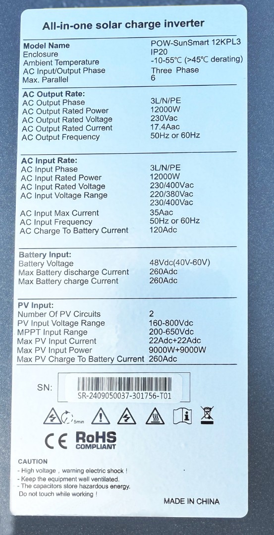Характеристики - Инвертор гибридный навесной PowMr 12 кВт, трехфазный для АКБ 48 Вт, model: POW-SunSmart 12KPL3