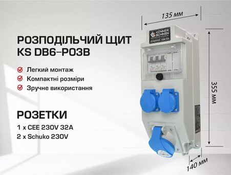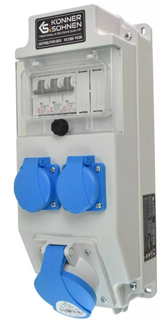 Распределительный щит KS DB6-P03В представляет собой низковольтное комплектное устройство, которое предназначено для подключения различных потребителей с напряжением 230/400В и током до 32А включительно. Распределительный щит подходит для строительных площадок, домов, гаражей, хозяйственных построек и т.д. Присоединение потребителей электричества допускается осуществлять как внутри, так и снаружи зданий.