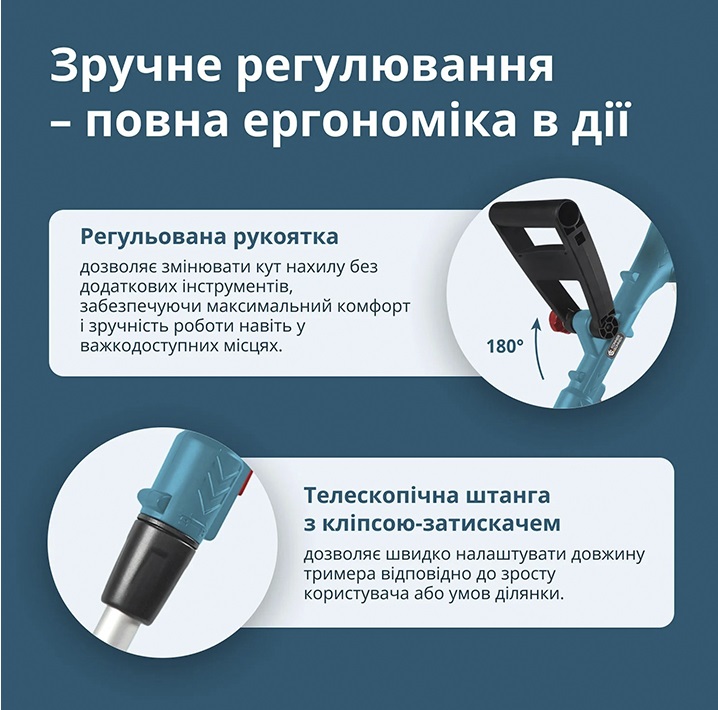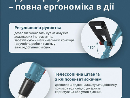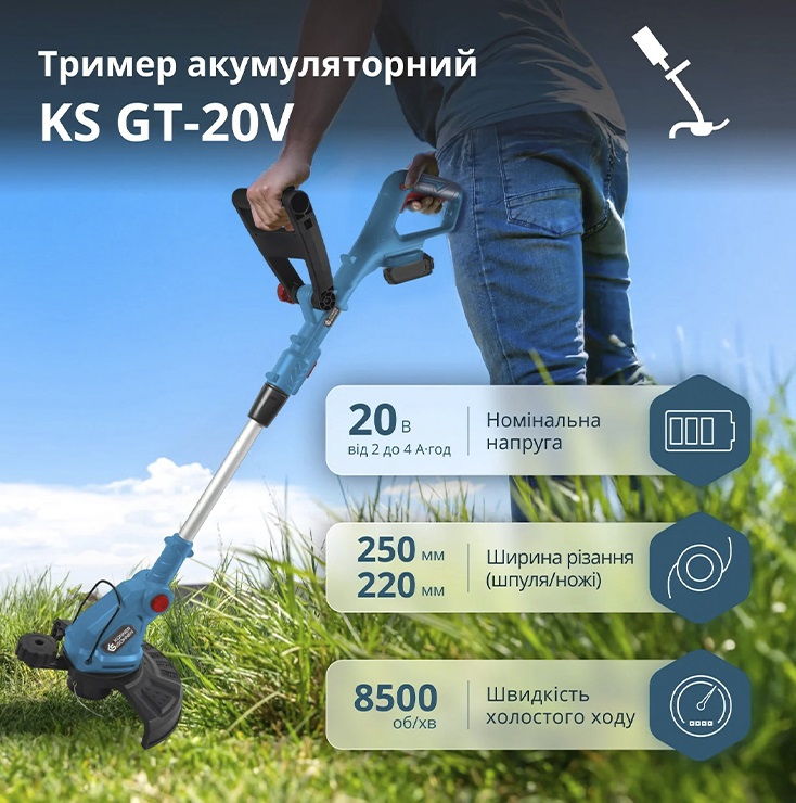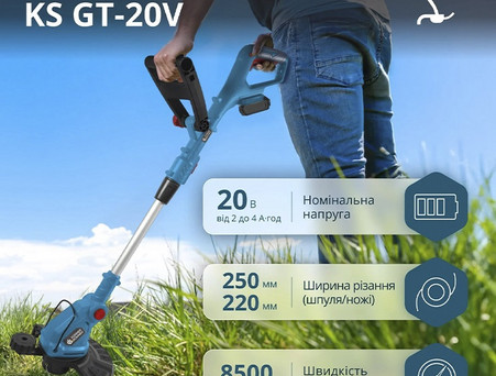 Телескопическая штанга дает возможность подстроить ее под рост пользователя или специфические условия работы. Система клипсы-зажима позволяет легко регулировать длину телескопической штанги, адаптируя триммер под рост пользователя или особенности ландшафта. Резиновое покрытие рукоятки обеспечивает комфортное держание, уменьшая усталость рук и повышая контроль над инструментом. наклона без дополнительных инструментов, обеспечивая максимальный комфорт и удобство работы даже в труднодоступных местах. Встроенная коробка ножей помогает всегда иметь сменные лезвия под рукой, устраняя необходимость в дополнительных сумках или контейнерах для хранения аксессуаров.Характеристики - Триммер аккумуляторный KS GT-20V