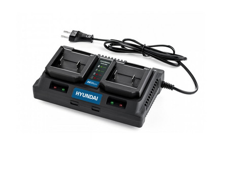 Основні переваги:одночасне заряджання двох акумуляторів.Повна сумісність із акумуляторами Hyundai 20V (серії HYBH).Незалежне управління кожним каналом.LED-індикатори стану зарядки.Захист від перегріву, перенапруги, короткого замикання.Ідеальний для моделей 2 А·год і 4 А·годХарактеристики - Зарядний пристрій Hyundai HYCH 2002