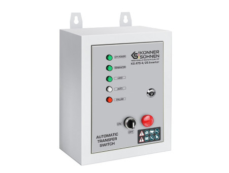 Блок автоматичного введення резерву (AВР) KS ATS 4/25 Inverter німецької торгової марки Könner & Söhnen автоматично запускає генератор і перемикає навантаження на нього при відключенні основного джерела живлення, та автоматично зупиняє роботу генератора при відновленні центрального електропостачання. Підходить для бензинових генераторів інверторного типу, що оснащені 7-піновим роз’ємом для підключення блоку автоматичного введення резерву (вхід для АВР) - з абревіатурою ATSR в артикулі. Він сумісний з інверторним генератором "Könner & Söhnen" KS 5500iES ATSR з вбудованим 7-контактним роз'ємом ATS.