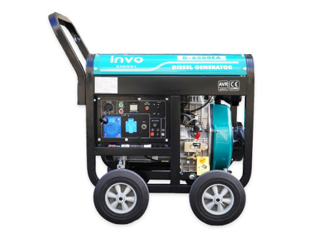 Дизельний генератор INVO D-6500EA - дизельний генератор з електронним датчиком напрацювання мотогодин, з світловим індикатором рівня масла, на колесах для побутового та промислового класу з вихідною напругою 220В електроживленням виробничих та побутових об'єктів, офісів, магазинів, державних установ. Дана модель генератора має номінальну потужність 6/7 кВт, чого буде достатньо для живлення електроприладів та обладнання у невеликій будівлі, а великий бак для палива на 12,5 л забезпечить безперебійну роботу до 11 години при 75% навантаженні.