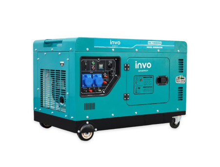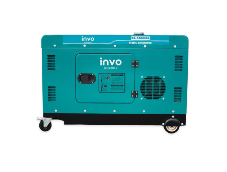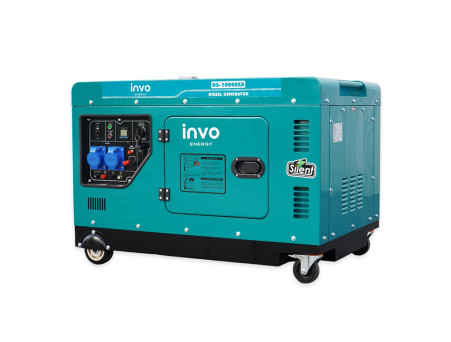Дизельний генератор INVO DS-10000EA - дизельний генератор у шумозахисному, антивандальному, всепогодному кожусі, з електронним датчиком напрацювання мотогодин, зі світловим індикатором рівня масла, на колесах для побутового та промислового класу з вихідною напругою 220В. Для побутових об'єктів, офісів, магазинів, державних установ. Дана модель генератора має номінальну потужність 9/10 кВт, чого буде достатньо для живлення електроприладів та обладнання у невеликій будівлі, а великий бак для палива на 30 л забезпечить безперебійну роботу до 12 години при 75% навантаженні.