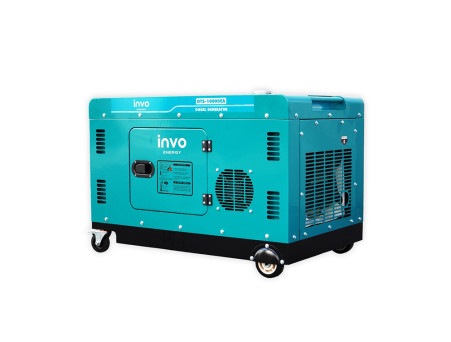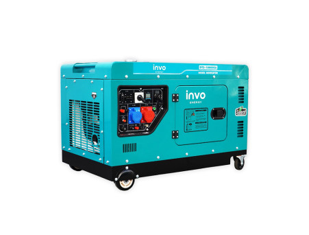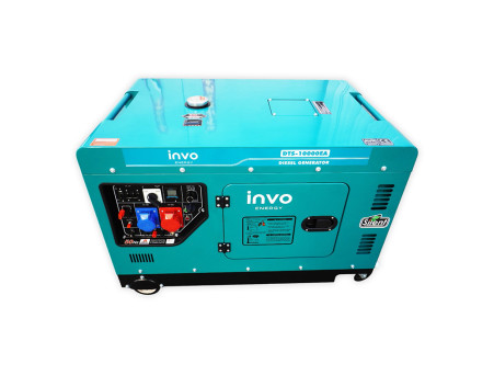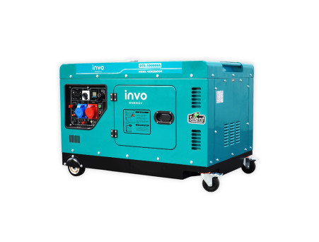 Дизельний генератор INVO DТS-10000EA - дизельний генератор у шумозахисному, антивандальному, всепогодному кожусі, з електронним датчиком напрацювання мотогодин, зі світловим індикатором рівня масла, на колесах для побутового та промислового класу з вихідною напругою 220В. Для побутових об'єктів, офісів, магазинів, державних установ. Дана модель генератора має номінальну потужність 9/10 кВт, чого буде достатньо для живлення електроприладів та обладнання у невеликій будівлі, а великий бак для палива на 30 л забезпечить безперебійну роботу до 12 години при 75% навантаженні.