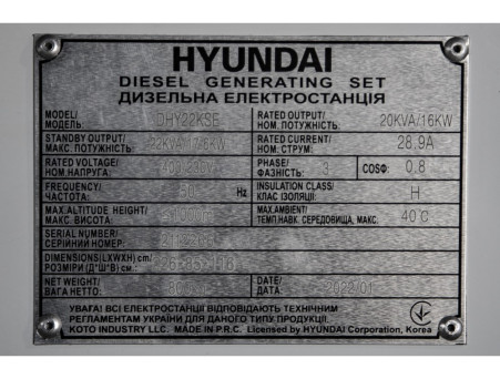 Характеристики - Електростанція дизельна Hyundai DHY 22KSE+ATS 60A