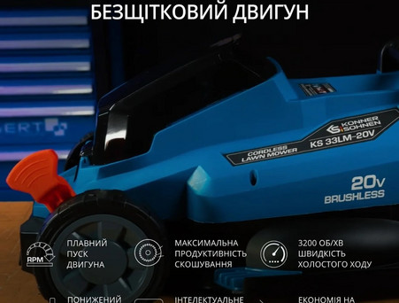 Акумуляторні газонокосарки Könner & Söhnen® мають ряд значних переваг відносно аналогічних моделей інших виробників. Вони створені на базі потужних безщіткових двигунів зі швидкістю обертів 3200 об/хв, що легко впораються навіть з великим навантаженням. Використання безщіткового двигуна забезпечує високу ефективність, тривалий термін служби та понижений рівень шуму. Крім того, такий тип двигуна має менше рухомих частин, що потребують обслуговування.
