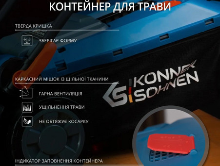 Косарки Könner & Söhnen® мають можливість як збору скошеної маси, так і її мульчування одразу після скосу. Функція мульчування є особливо корисною для підживлення газону та покращення його стану. Ширина захвату косарок сягає 33 см, що забезпечує ефективне скошення та мульчування навіть при великій площі газону. - КОМБІНОВАНИЙ КОНТЕЙНЕР ДЛЯ ТРАВИ