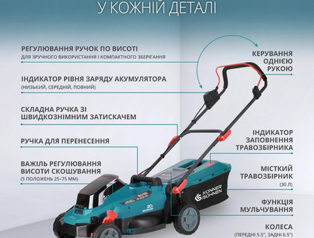 Акумуляторні газонокосарки Könner & Söhnen® на базі єдиної акумуляторної системи для серії садових інструментів нашої торговельної марки – це ідеальне рішення для догляду за газоном. Найбільшою перевагою акумуляторних газонокосарок є відсутність кабелю та подовжувачів для живлення від центральної електромережі, а отже гарантія максимальної мобільності та автономності роботи.
