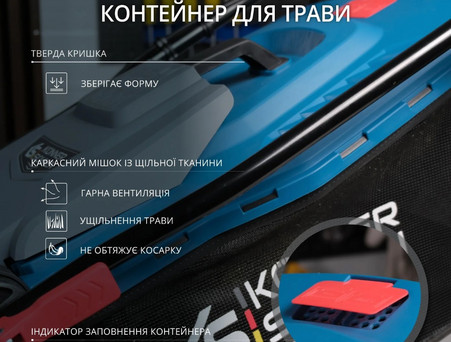 Травозбірники косарок виготовлені комбінованим способом - мають пластикову кришку та каркасний мішок зі щільної тканини. Така модифікація не обтяжує косарку, контейнери зберігають форму, мають гарну вентиляцію та легко витрушуються при необхідності. Ємність контейнера складає 40 л, що дозволяє збирати достатній об’єм скошеної трави. Також вони оснащені індикатором заповнення контейнеру.