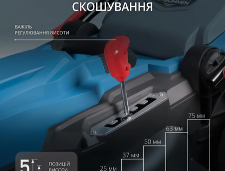 Зручний важіль регулювання рівня скосу має 5 позицій, діапазон висоти зрізу від 25 мм до 75 мм, що надає можливість налаштовувати газонокосарку під індивідуальні потреби користувача та дозволяє досягати оптимального висоти газону.