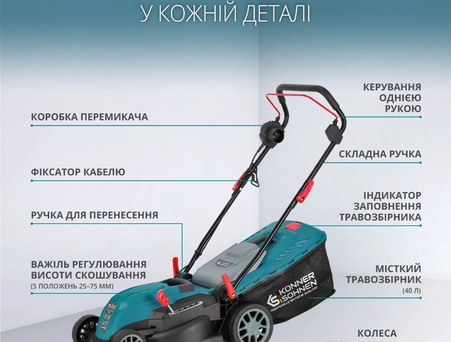 Електричні газонокосарки Könner & Söhnen® мають просту конструкцію, завдяки чому підготовка до роботи, обслуговування чи зберігання здійснюється швидко, легко та без застосування додаткового інструменту.