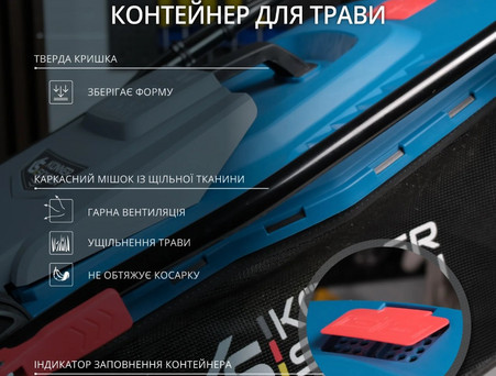 Травозбірники косарок виготовлені комбінованим способом - мають пластикову кришку та каркасний мішок зі щільної тканини. Така модифікація не обтяжує косарку, контейнери зберігають форму, мають гарну вентиляцію та легко витрушуються при необхідності. Ємність контейнера складає 40 л, що дозволяє збирати достатній об’єм скошеної трави. Також вони оснащені індикатором заповнення контейнеру.
