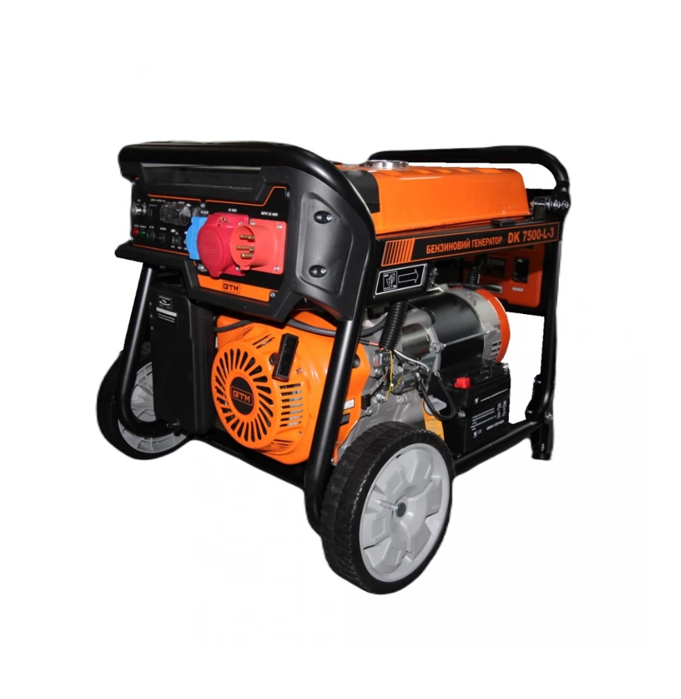 GTM DK7500-L-3 – 3-фазний бензиновий електрогенератор для забезпечення живлення обладнання у разі відсутності електроенергії. Оснащений 4-х тактним двигуном DK192F, який відрізняється економічністю, низьким рівнем викидів та шуму. Максимальна потужність на виході генератора за 3-фазного підключення становить 7.5 кВт. Ідеальний варіант для використання у побутових умовах, на дачі або у невеликих магазинах. Під час роботи повного бака палива об'ємом 25 л вистачить до 7:00 при 100% навантаженні. Вбудований АВР дозволяє налаштувати автоматичне увімкнення генератора при відключенні мережі.