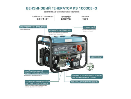 Характеристики - Генератор бензиновий Könner&Söhnen KS 10000E-3 7.5 кВт/8.0 кВт 380В з ел.старт