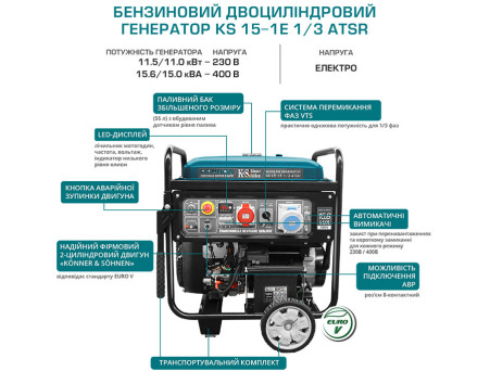 Опис Генератор бензиновий Könner&Söhnen KS 15-1E 1/3 ATSR 11кВт/11.5кВт(220В) / 12кВт/12.5кВт(400В)
