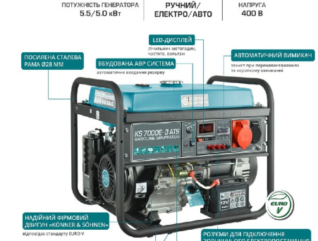 Однією з унікальних особливостей моделі генератора KS 7000E-3 ATS з електрозапуском є функція ATS (АВР — автоматичне введення резерву). Ця функція дозволяє генератору автоматично включатися в момент відключення світла, а потім автоматично вимикатися в момент повернення електроживлення. Вона необхідна в разі використання об’єкту жінками або літніми людьми, при від’їздах, на об’єктах із суворим температурним або світловим режимом. У моделях інших брендів для виконання даної функції необхідно купувати громіздке, дороге обладнання, яке потребує додаткової, складної установки. У нашому випадку блок вже встановлений в генератор, інсталяція такого генератора максимально спрощена, а вартість даних моделей торгової марки «Könner & Söhnen» є доступною для будь-якого гаманця.