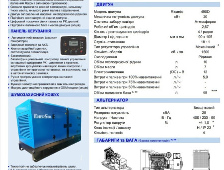 Характеристики - Генератор дизельний ENERSOL SCRS-25DM 18.0/20.0 кВт, трифазний, з електрозапуском
