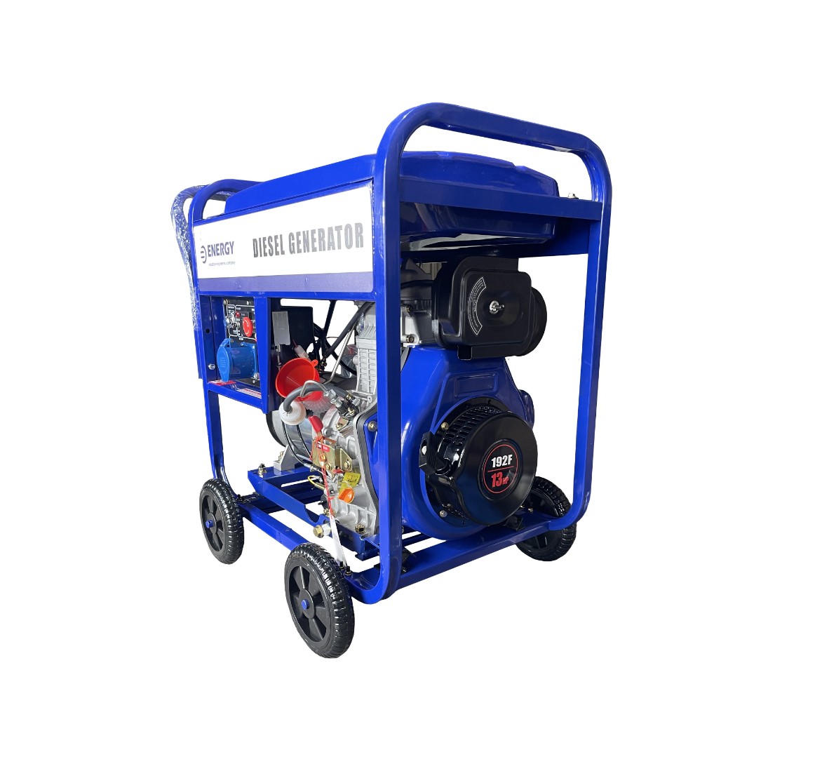 Зручність: з шумопоглинаючим кожухом, виходом постійного струму 12В, заземлювачем, автоматичним регулюванням напруги (AVR), 4 колесами, 2 ручками та паливним баком об'ємом 12,5 л.