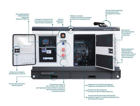 Станція оснащена низько обертовим 4-циліндровим двигуном Deutz з рідинним охолодженням. Німецька компанія Deutz вже понад 150 років виробляє дизельні двигуни (в тому числі для автомобільної та сільгосптехніки), що поєднують у собі сучасні технології та матеріали, найвищу якість, надійність, безвідмовність та довговічність. Мотори Deutz успішно працюють у найнесприятливіших умовах та витримують максимальні навантаження без зниження моторесурсу. Крім того модель дизельного генератора KS 33-3DE-G оснащена 4-полюсним безщітковим альтернатором змінного струму з системою автоматичного регулювання напруги, підігрівом для зимового використання, з паливним баком на 57 літрів, розрахованому на понад 15 годин автономної роботи без дозаправки (при середньому навантаженні 50% витрата палива складає 3,7 літри/год), можливістю підключення системи автоматичного запуску/зупинки, всепогодним захисним антивандальним корпусом із звукоізоляцією та антикорозійним гальванічним покриттям.