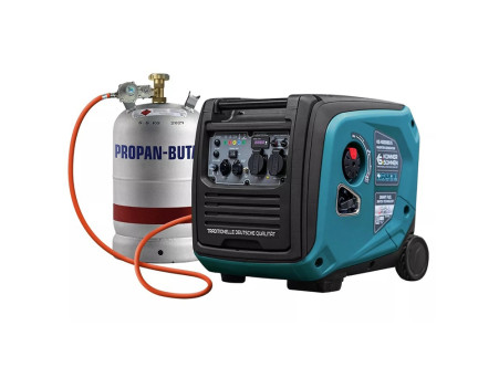 У комплект поставки входить все необхідне для використання газу в якості пального:1. Вбудований редуктор, що забезпечує подачу газу під час роботи двигуна та запобігає витоку газу, а також зупиняє подачу газу при вимкненому генераторі.2. Шланг для підключення газового балону довжиною 1,5 м забезпечує комфортне під’єднання.3. Для підвищення надійності газової магістралі на шланг встановлений додатковий редуктор, який кріпиться на балон. Він забезпечує зниження тиску та знімає можливість перевантаження газового з’єднання. Потрібно лише під’єднати генератор до балону та запустити двигун.