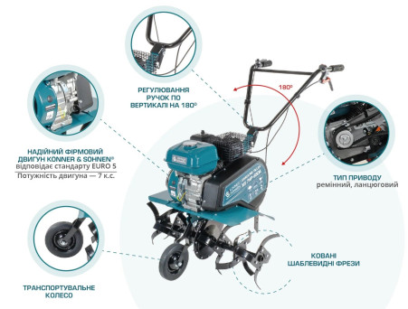 Ковані шаблевидні фрези підходять для використання культиватора з будь-яким типом ґрунту, як з цілинним, так і з більш доглянутим. Для захисту рослин при оранці передбачені захисні бокові диски. Ширина обробки даної моделі складає 70 см, глибина — до 27 см.