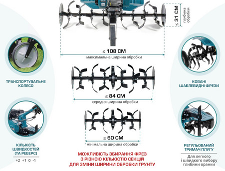 Ковані шаблевидні фрези підходять для використання культиватора з будь-яким типом ґрунту, як з цілинним, так і з більш доглянутим. Для захисту рослин при оранці передбачені захисні бокові диски. Фрези збираються групою з 4-х ножів. Металеві диски входять до комплекту.