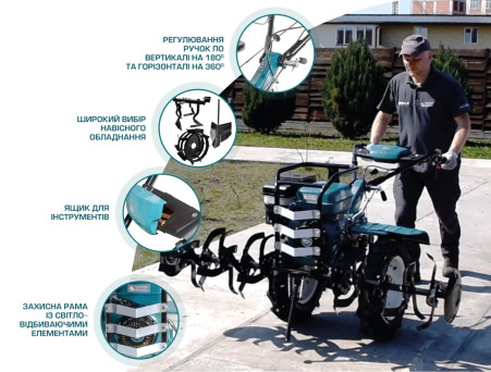 Ергономічна панель управління дозволяє швидко управляти і легко маневрувати культиватором. Можливість вертикального регулювання ручок на 180° та горизонтального на 360° дозволяє налаштувати культиватор під будь-якого користувача, забезпечує легке керування та зручне зберігання культиватора. Панель оснащена кейсом для інструментів.