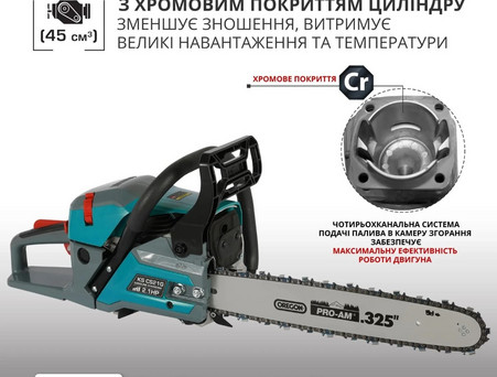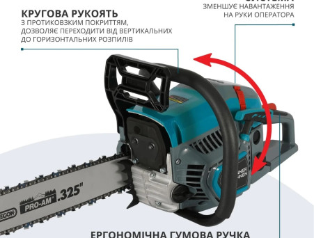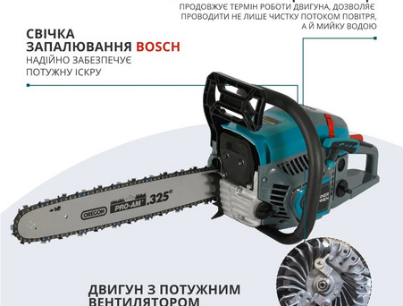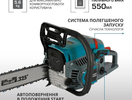 - Система полегшеного запуску: Завдяки системі полегшеного запуску користуватися пилою зручно навіть за низьких температур. Стартер оснащений додатковою пружиною, яка спрощує запуск двигуна, а ручний праймер дозволяє швидко подати паливну суміш у карбюратор.