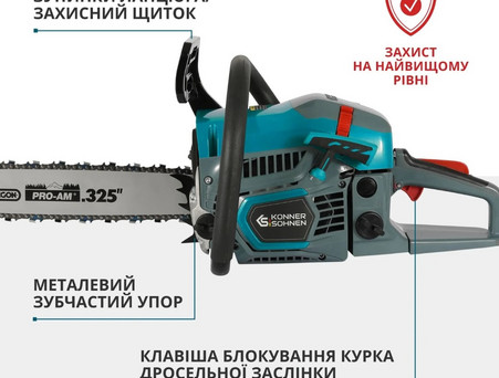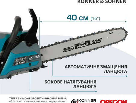 - Гнучкість у виборі комплектуючих: Konner&Sohnen надає можливість вибору шини та ланцюга відповідно до типу деревини та необхідного обсягу робіт. Доступні комплектуючі від Könner&Söhnen і Oregon, що забезпечує гнучкість та оптимальну продуктивність інструменту.
