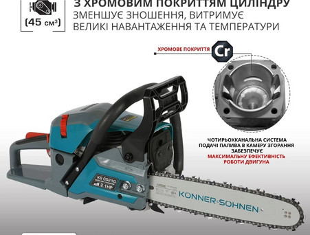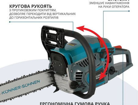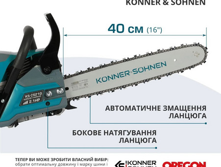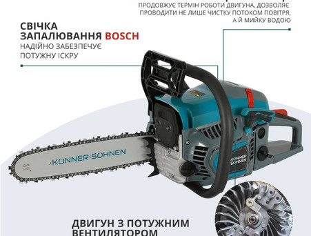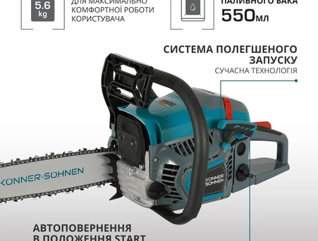 - Можливість вибору комплектуючих: Для ефективної роботи можна обрати шину і ланцюг необхідної довжини залежно від виду деревини та типу робіт. Könner & Söhnen пропонує комплектуючі, які можна адаптувати під конкретні потреби для досягнення оптимальної продуктивності.