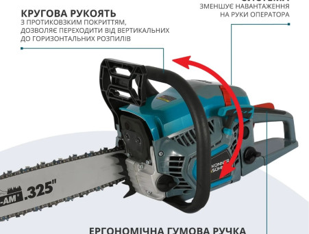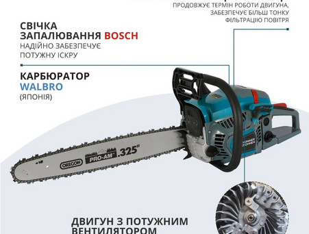 - Потужний двигун: Бензопила оснащена надійним двигуном об'ємом 54,5 см³, потужністю 3.1 к.с. (2.3 кВт), що забезпечує високу продуктивність. Максимальна кількість обертів досягає 11000±500 об/хв, дозволяючи інструменту швидко й ефективно різати навіть тверді породи деревини.