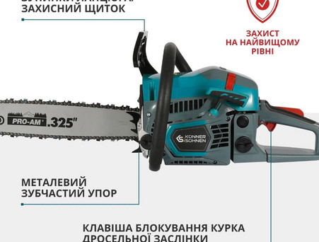 - Безпека: Безпека під час роботи – головний пріоритет компанії Könner & Söhnen. Пила оснащена інерційним гальмом, яке миттєво зупиняє ланцюг у випадку непередбачених ситуацій. Надійний уловлювач ланцюга та клавіша блокування курка дросельної заслонки виключають ризик випадкового запуску інструмента.
