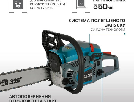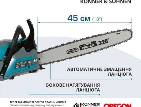 - Вибір шини та ланцюга: Könner & Söhnen пропонує широкий вибір шин та ланцюгів, що дозволяє підібрати оптимальні варіанти для ваших потреб. Правильний вибір шин і ланцюгів подовжує термін служби інструменту та зменшує витрати на його обслуговування.