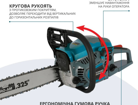 - Комфорт під час роботи: Ергономічний дизайн та ефективна антивібраційна система роблять роботу з бензопилою максимально комфортною. Ергономічні рукоятки з протиковзким покриттям забезпечують надійний хват, що допомагає зменшити втому навіть при тривалому використанні.