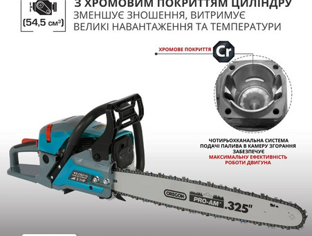 - Потужний двигун: Об’єм двигуна становить 54.5 см³, що забезпечує потужність 3.1 к.с. (2.3 кВт) і максимальні оберти до 11000 об/хв. Це дозволяє ефективно справлятися навіть з найскладнішими завданнями.