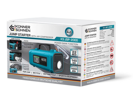 Німецька ТМ Könner & Söhnen представляє вашій увазі пускозарядний пристрій з акумуляторним компресором 4 в 1 KS JSP-2000 - це незамінний мультифункційний пристрій для вашого авто. Він поєднує у собі функції пускового пристрою та зарядного пристрою для акумуляторів бензинових або дизельних авто, функцію акумуляторного компресора для широкого спектру завдань, а також може також виконувати функцію повербанку та ліхтаря. Техніка німецької ТМ Könner & Söhnen вже успішно продається в понад 20 країнах Європи, пройшла багаторічне випробування вибагливими європейськими споживачами та має безліч позитивних відгуків.