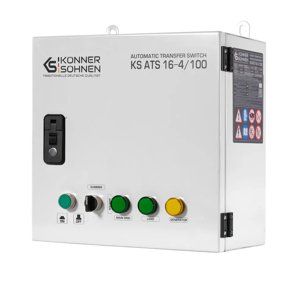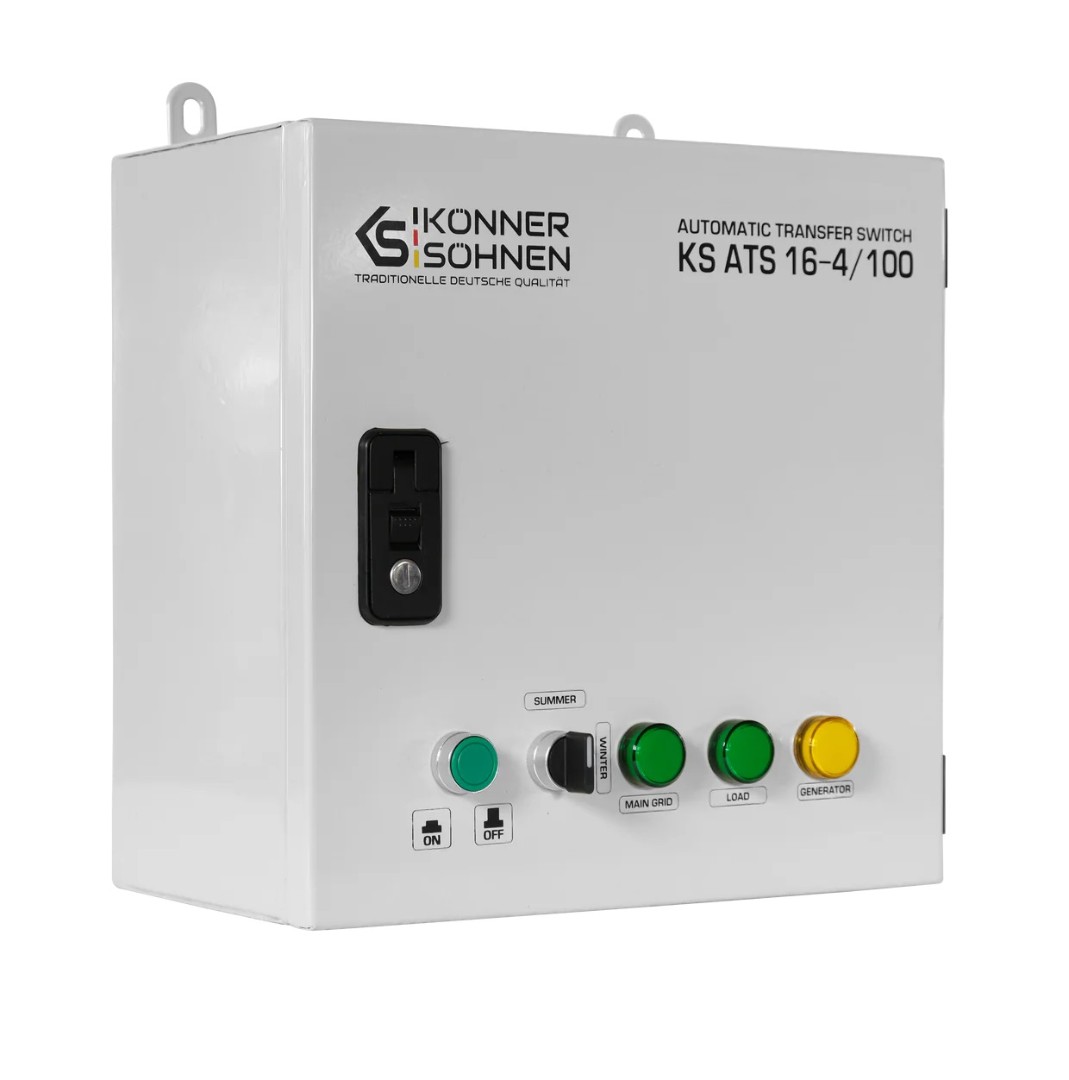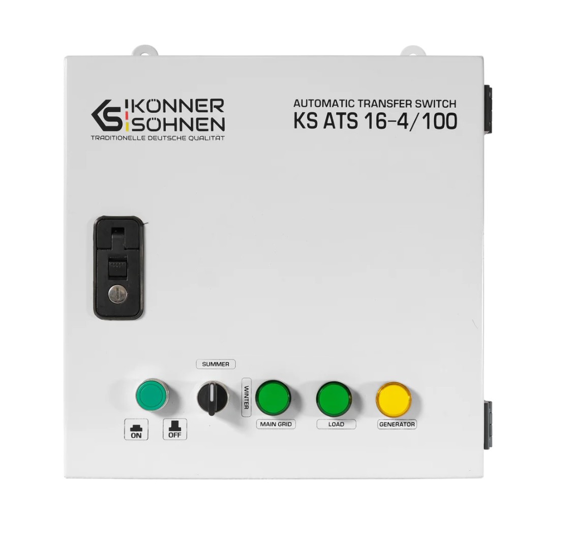Блок автоматического ввода резерва (ABP) KS ATS 16-4/100 германской торговой марки Könner & Söhnen автоматически запускает генератор и переключает нагрузку на него при отключении основного источника питания и автоматически останавливает работу генератора при восстановлении центрального электроснабжения.