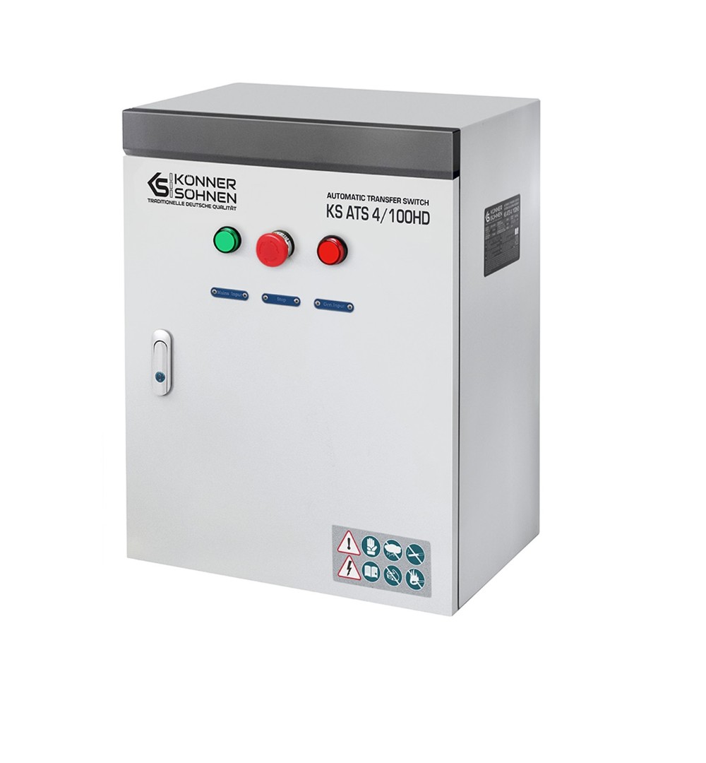 Блок автоматического ввода резерва (ABP) KS ATS 4/100HD немецкой торговой марки Könner & Söhnen автоматически запускает электростанцию и переключает нагрузку на него при отключении основного источника питания и автоматически останавливает работу электростанции при восстановлении центрального электроснабжения. Подходит для дизельных электростанций «Könner&Söhnen». Блок АВР может работать как в автоматическом, так и в ручном режиме.