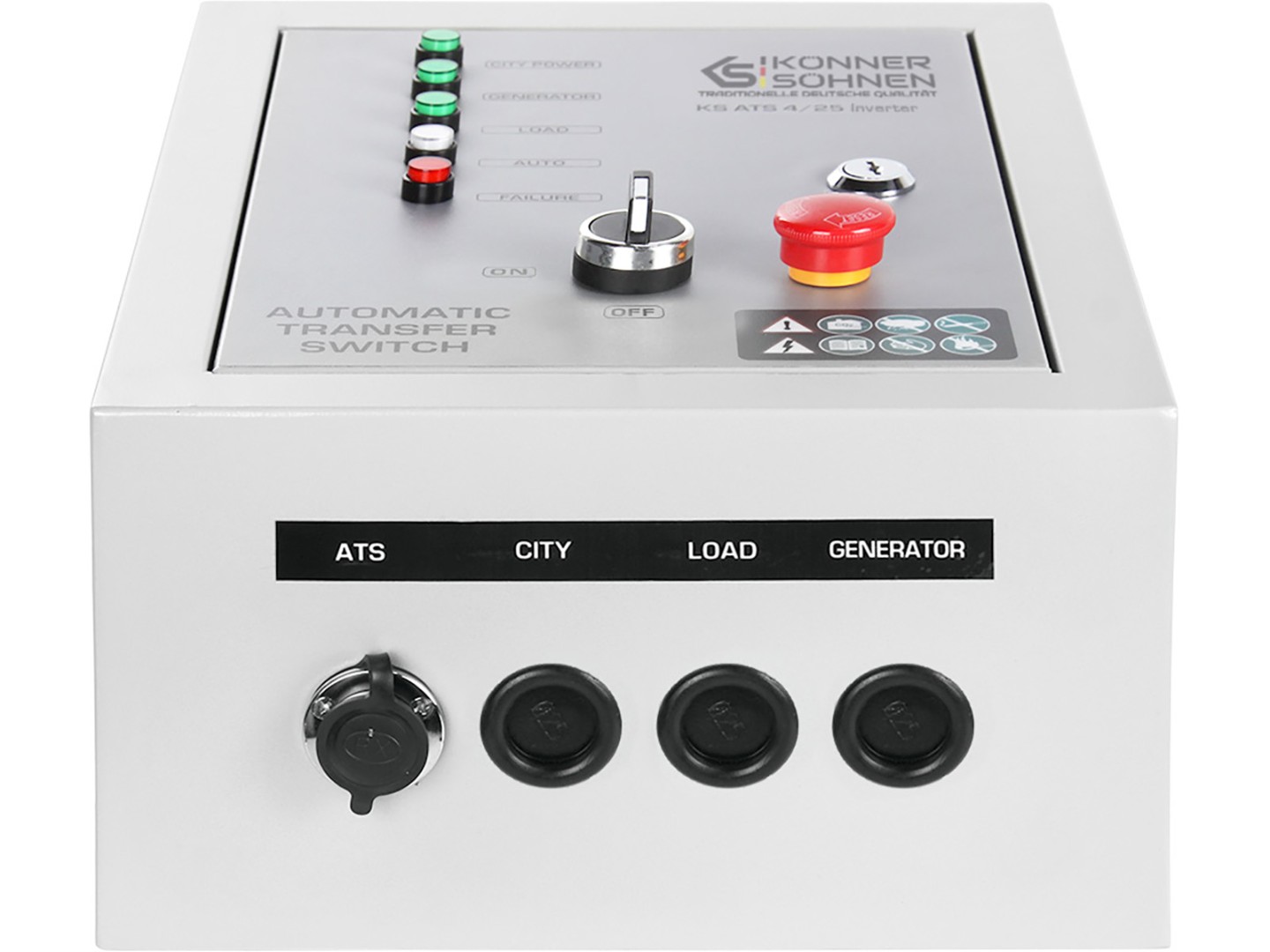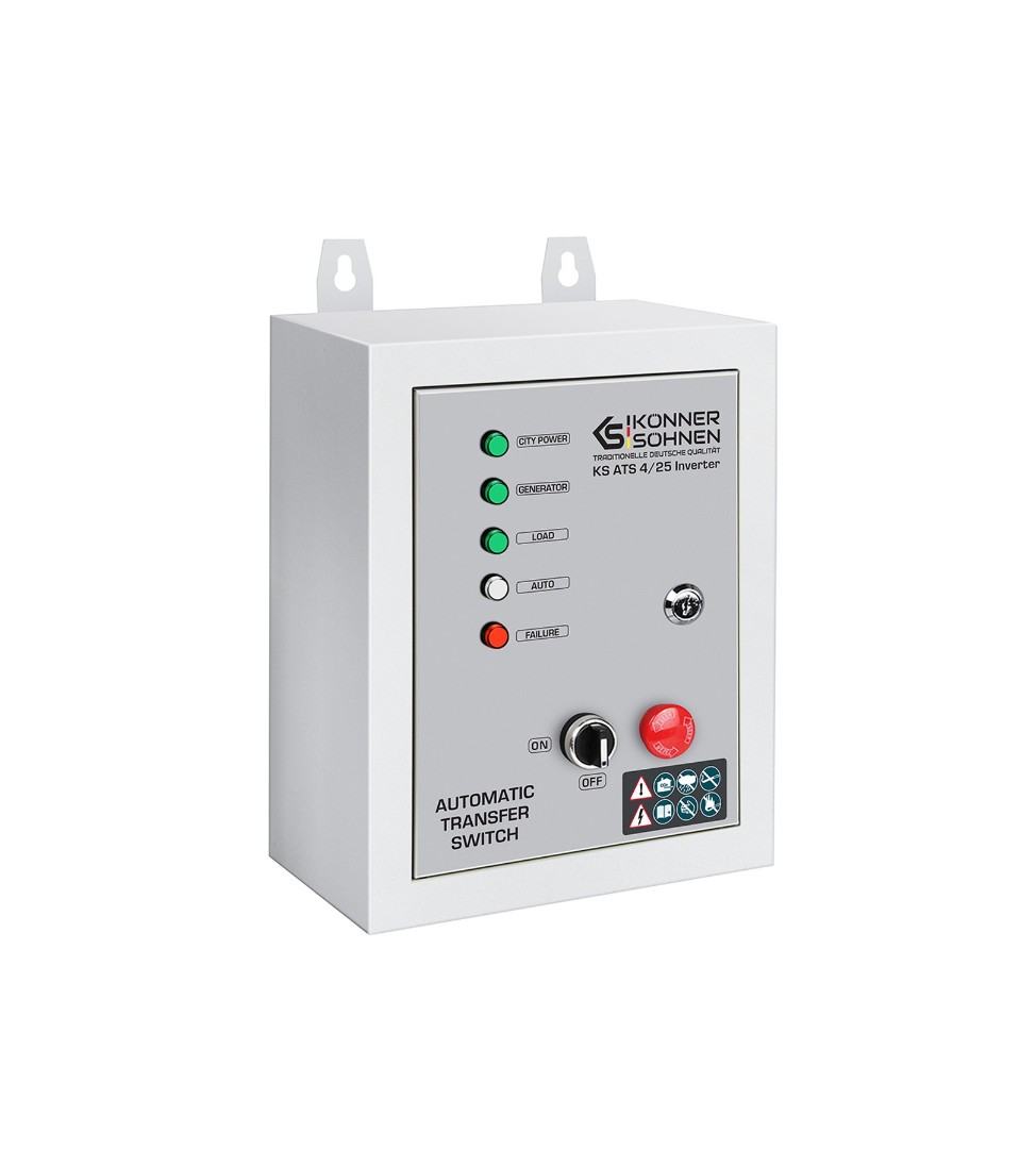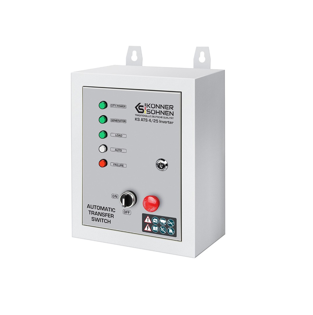 Блок автоматического ввода резерва (ABP) KS ATS 4/25 Inverter немецкой торговой марки Könner & Söhnen автоматически запускает генератор и переключает нагрузку на него при отключении основного источника питания и автоматически останавливает работу генератора при восстановлении центрального электроснабжения. Подходит для бензиновых генераторов инверторного типа, оснащенных 7-пиновым разъемом для подключения блока автоматического ввода резерва (вход для АВР) – с аббревиатурой ATSR в артикуле. Он совместим с инверторным генератором "Könner & Söhnen" KS 5500iES ATSR со встроенным 7-контактным разъемом ATS.