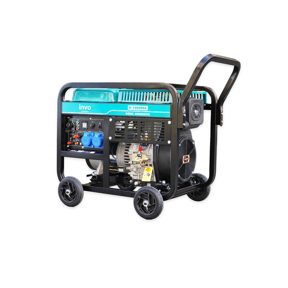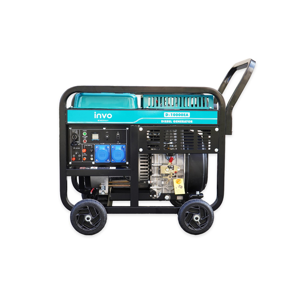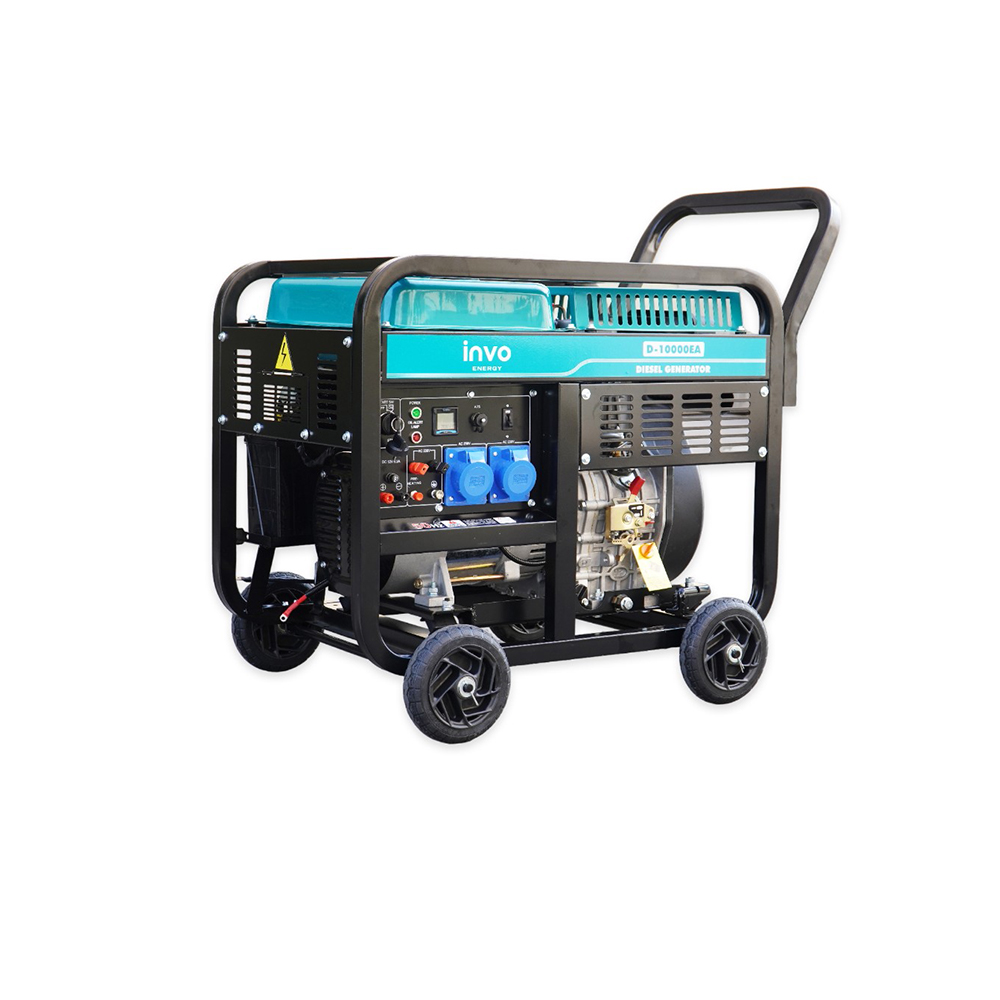 Дизельный генератор INVO D-10000EA - дизельный генератор с электронным датчиком наработки моточасов, со световым индикатором уровня масла, на колесах для бытового и промышленного класса с выходным напряжением 220В, с медной обмоткой, предназначенный для обеспечения электропитанием производственных и бытовых. Данная модель генератора имеет номинальную мощность 9 кВт, чего достаточно для питания электроприборов и оборудования в небольшом здании, а большой бак для топлива на 25 л обеспечит бесперебойную работу до 12 часов при 75% нагрузке.