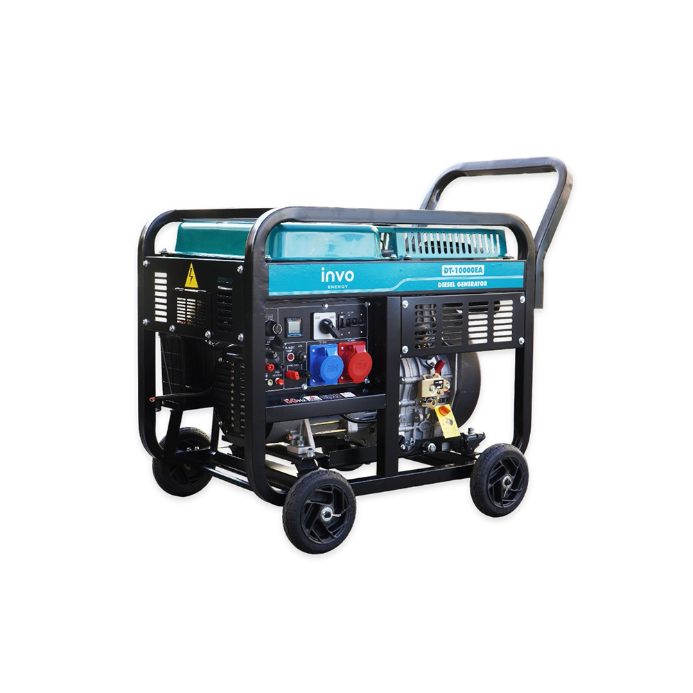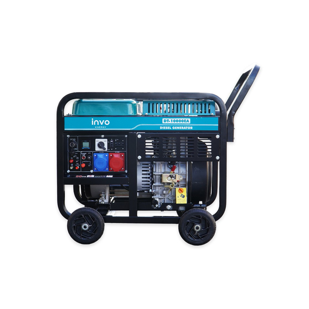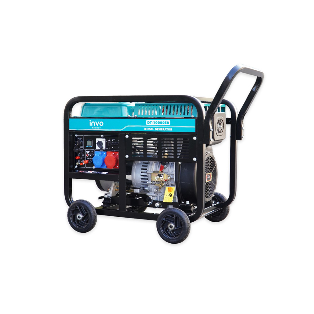 Дизельный генератор INVO DT-10000EA - дизельный генератор с электронным датчиком наработки моточасов, со световым индикатором уровня масла, на колесах для бытового и промышленного класса с выходным напряжением 230/380 В, с медной обмоткой, предназначенный для обеспечения электропитания. магазинов, государственных учреждений. Данная модель генератора имеет номинальную мощность 9/10 кВт, чего достаточно для питания электроприборов и оборудования в небольшом здании, а большой бак для топлива на 25 л обеспечит бесперебойную работу до 12 часов при 75% нагрузке.