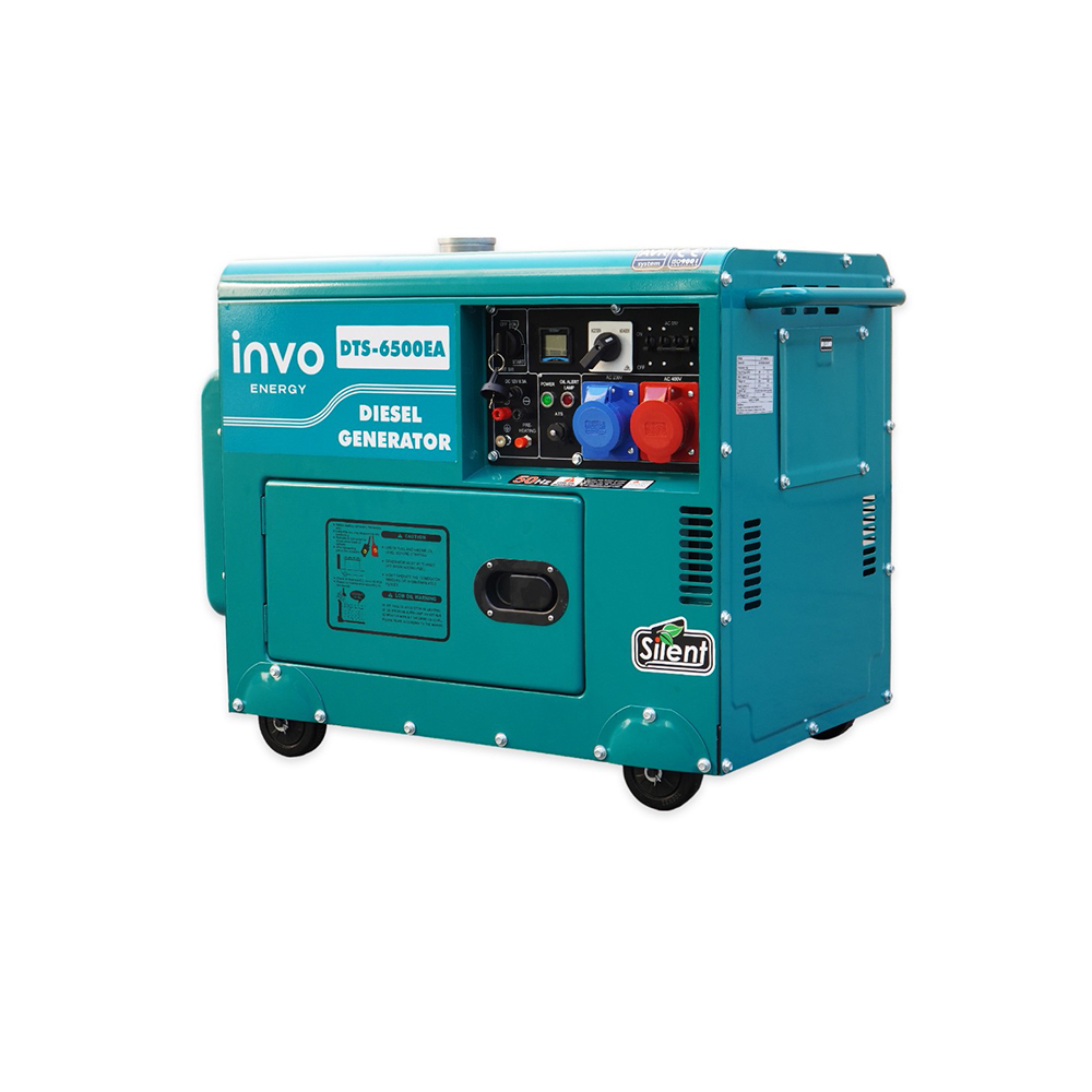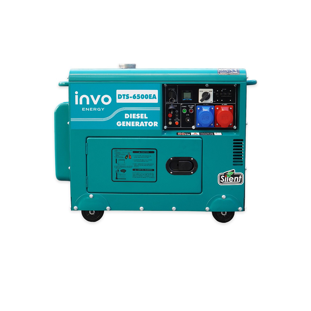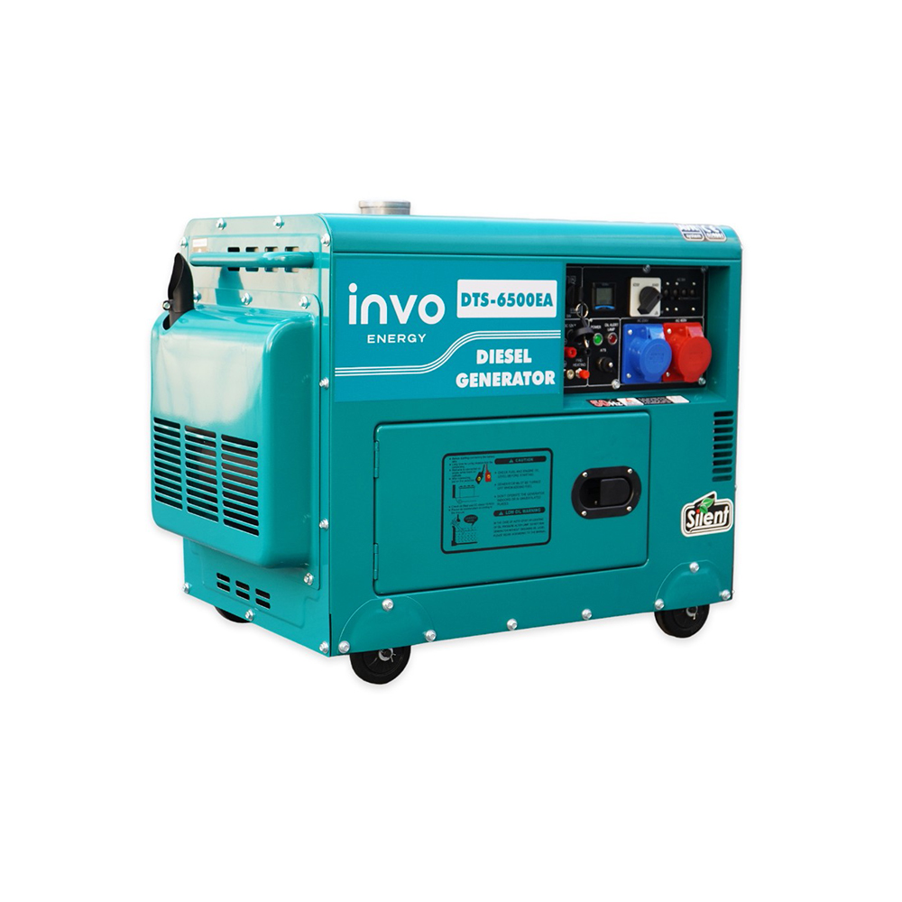 Дизельный генератор INVO DТS-6500EA - дизельный генератор в шумозащитном, антивандальном, всепогодном кожухе, с электронным датчиком наработки моточасов, со световым индикатором уровня масла, на колесах для бытового и промышленного класса с выходным напряжением 230/38 офисов, магазинов, государственных учреждений. Данная модель генератора имеет номинальную мощность 6/6,5 кВт, чего достаточно для питания электроприборов и оборудования в небольшом здании, а большой бак для топлива на 15 л обеспечит бесперебойную работу до 12 часов при 75% нагрузке.