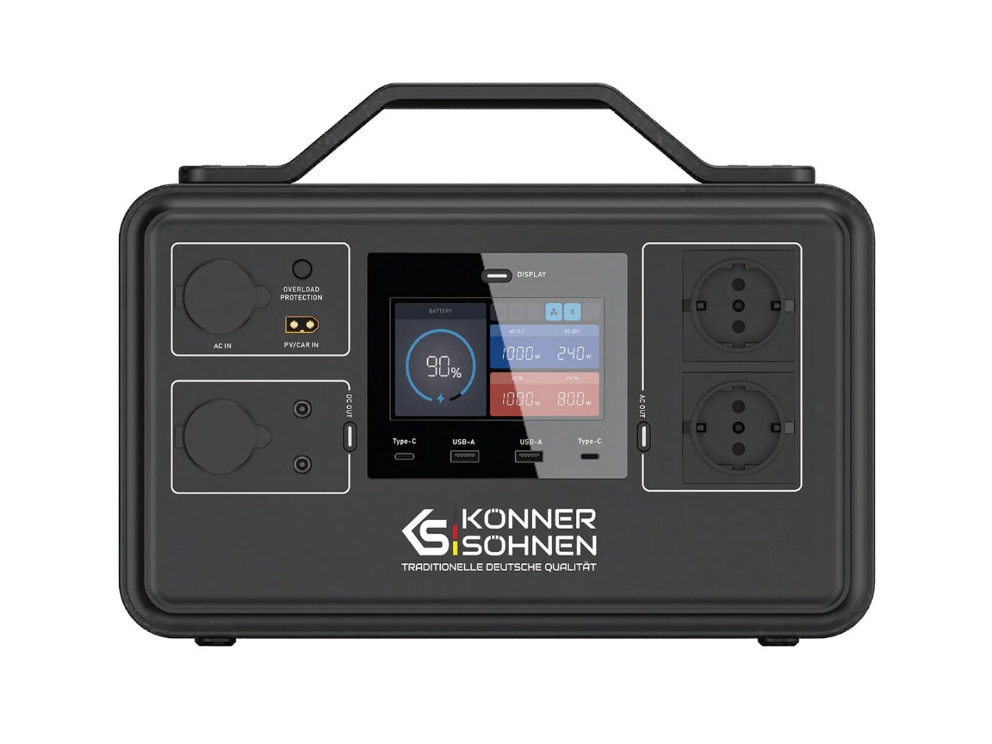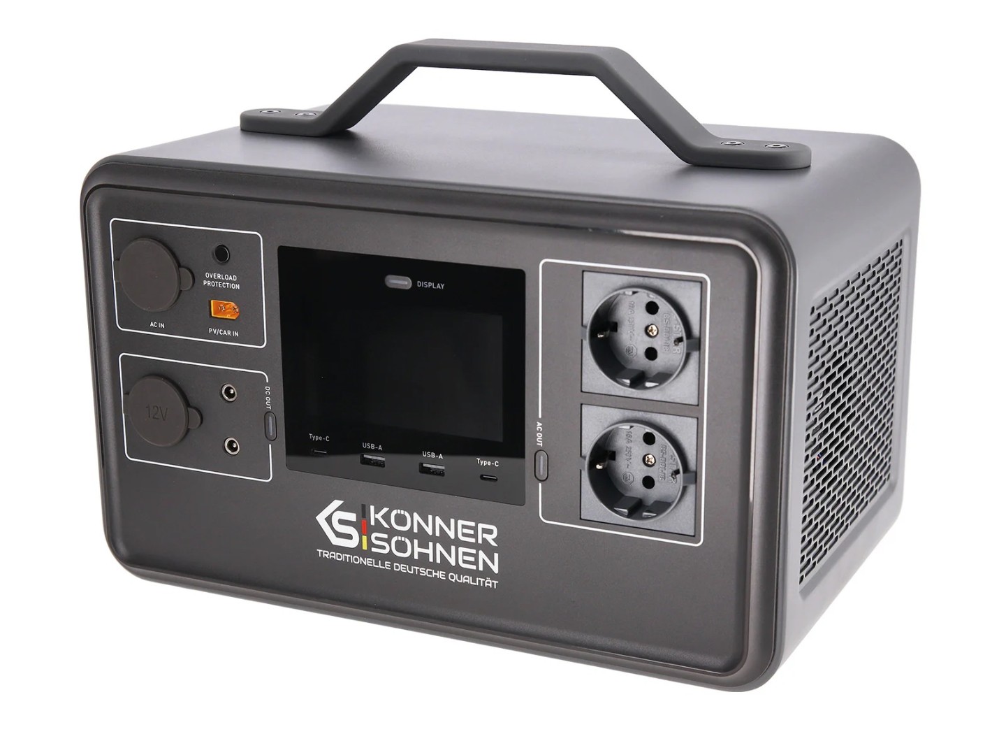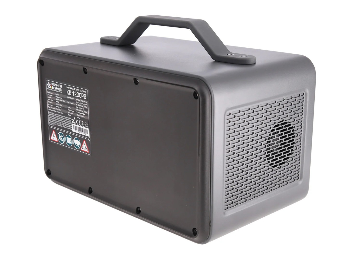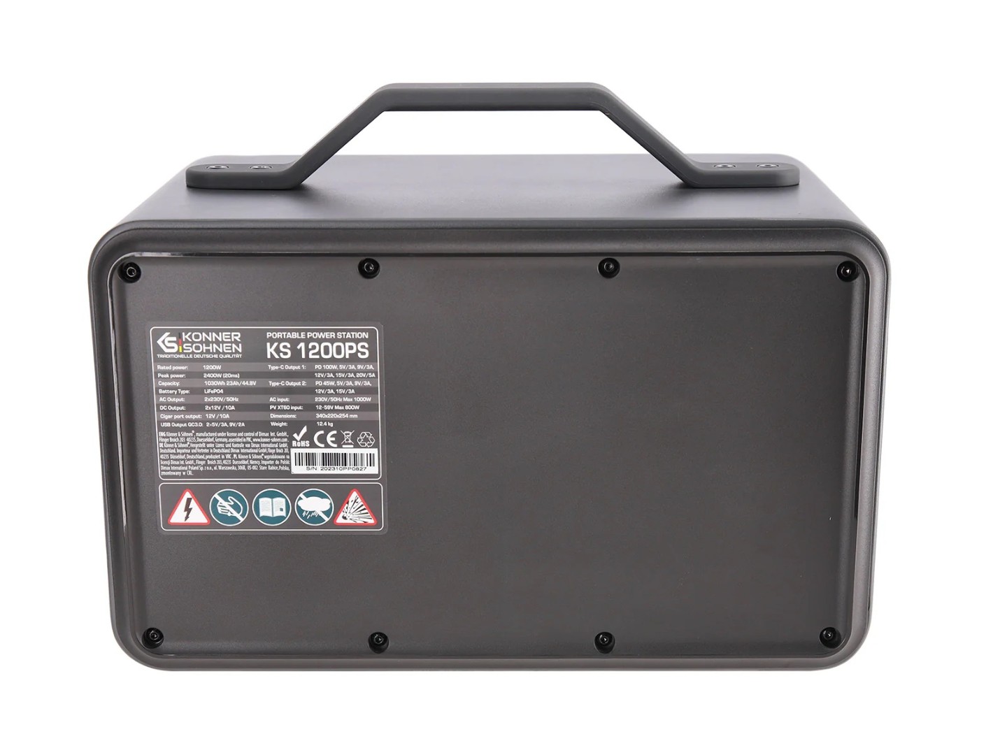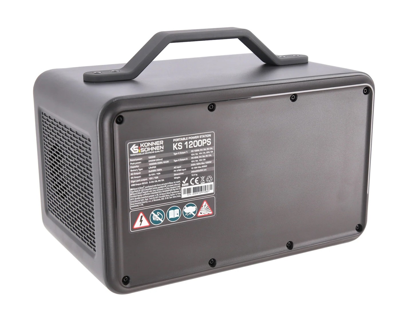Мобильная портативная электростанция KS 1200PS немецкой торговой марки Könner & Söhnen производится с использованием высококачественных LifePO4 литий-железо-фосфатных аккумуляторов высокой емкости, имеющих более высокую энергетическую плотность по сравнению с Li-ion, они могут сохранять больше энергии в компактном формате и имеют большой жизненный цикл – 4000 циклов заряд-разряд. Она станет надежным помощником для зарядки устройств в пути или сбоев электроснабжения. Ее мощности будет достаточно для работы такой техники как смартфон, цифровая камера, планшет, дрон, мини-холодильник, накачивающий насос, вентилятор. Она работает тихо, поэтому позволит питать электрические устройства и наслаждаться временем без мешающего шума.