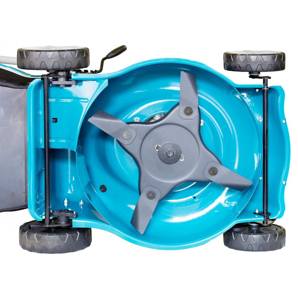 4-лопастный нож. Газонокосилка оборудована металлическим 4-х лопастным ножом с защитой при столкновениях с твердыми предметами. При ударе нож автоматически складывается и возвращается в рабочее положение центробежной силой при включении газонокосилки.