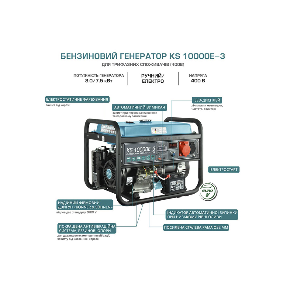 Характеристики - Бензиновый генератор Könner&Söhnen KS 10000E-3 7.5 кВт/8.0 кВт 380В с эл.старт