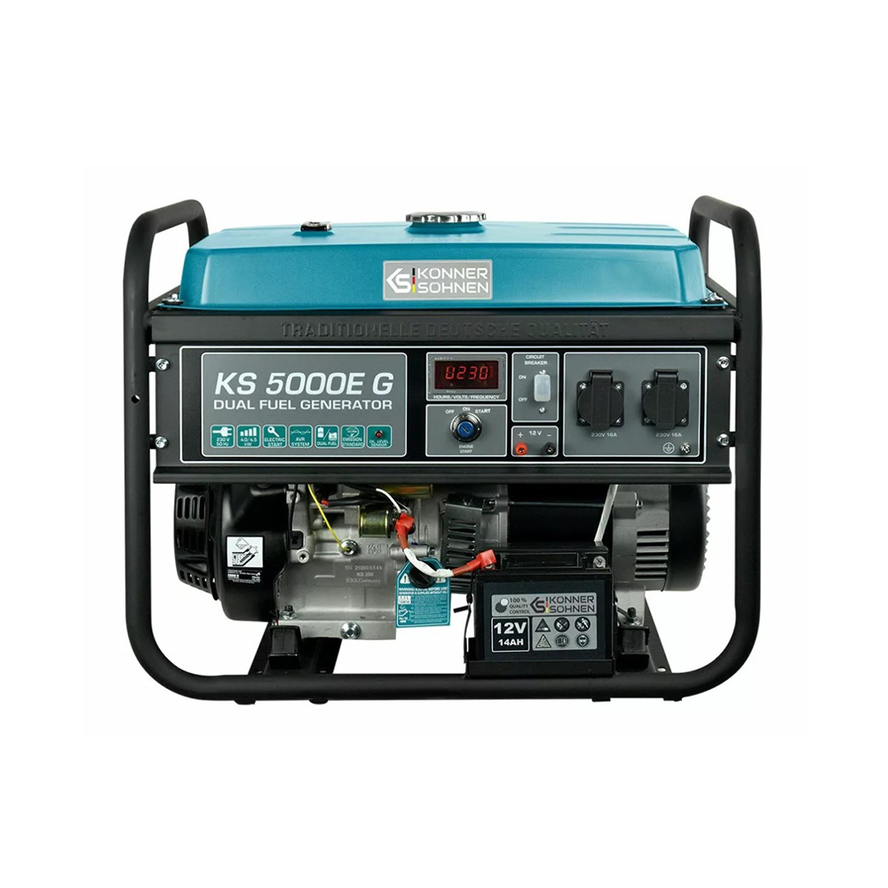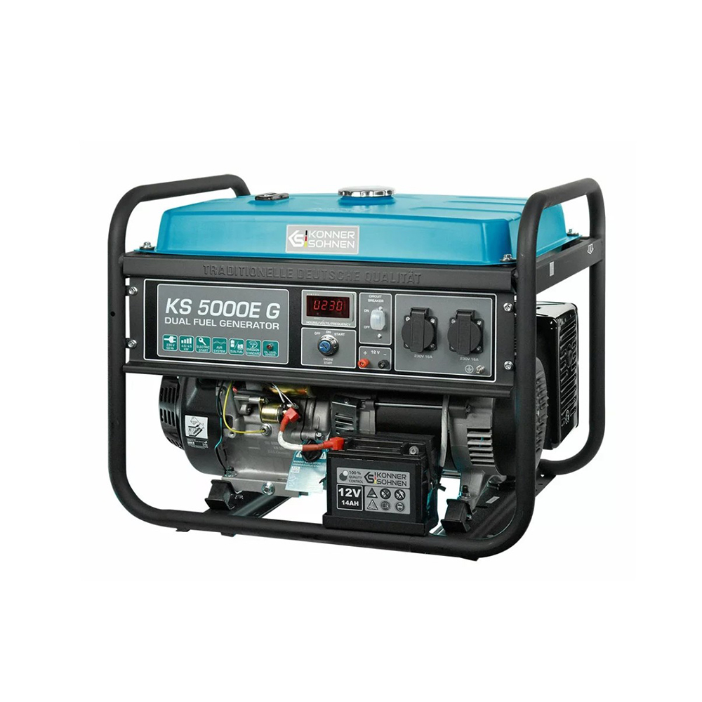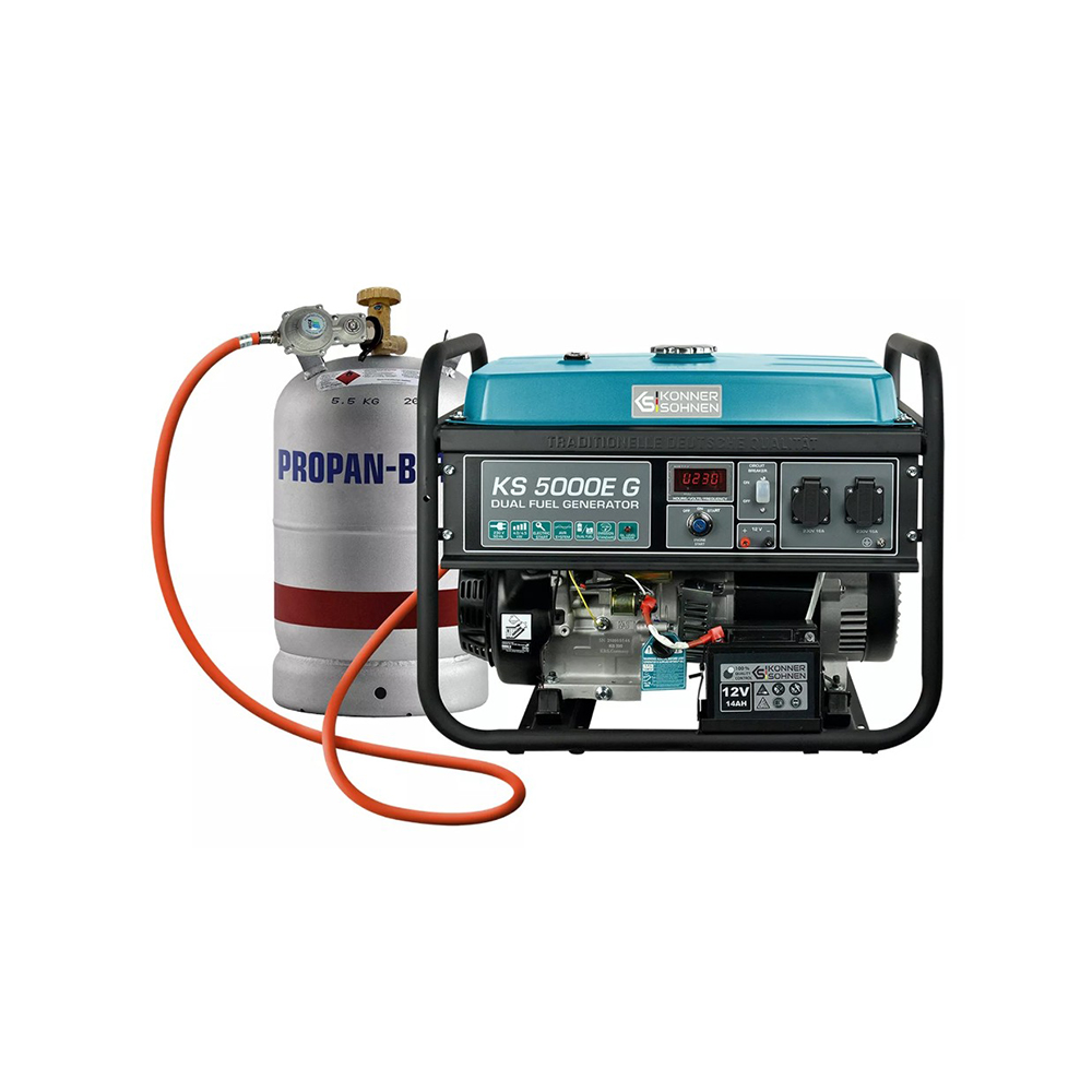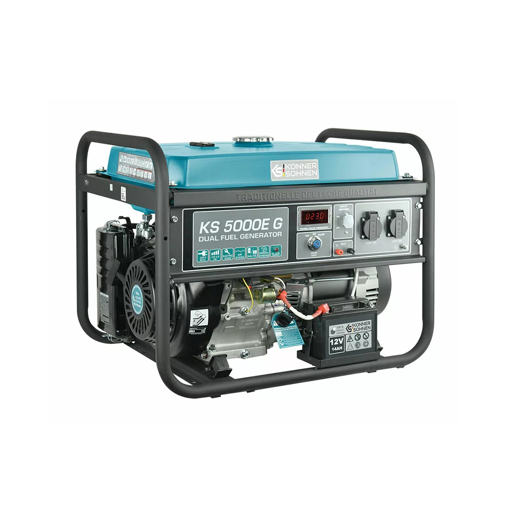 Газобензиновый генератор KS 5000E G немецкой ТМ Könner & Söhnen серии DUAL FUEL — это двухтопливная модель, актуальная поскольку имеет оптимальные характеристики, оснащена как ручным, так и электрозапуском. Мощности генератора достаточно для аварийного питания регулярно используемых электроприборов. Генератор одинаково эффективен как на бензине, так и на газе (пропан-бутан) — генерируемые параметры будут аналогичны.