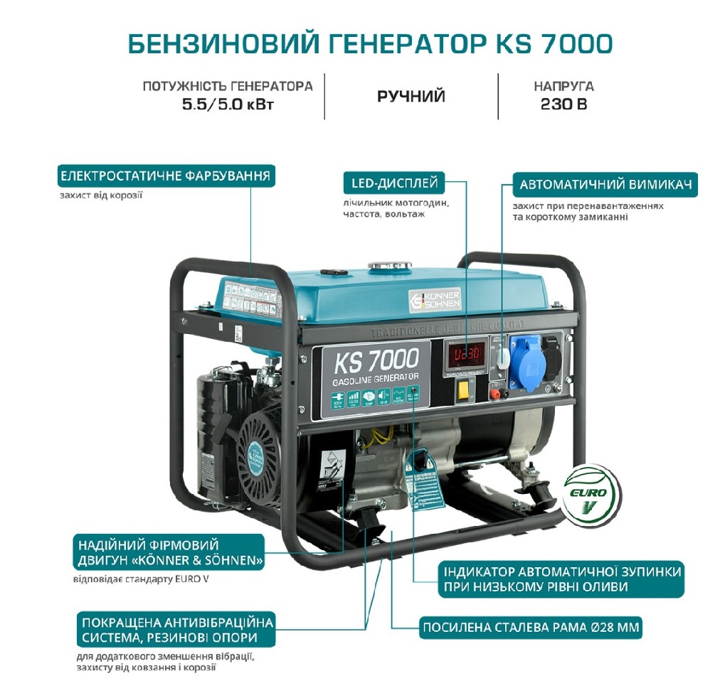 Характеристики - Генератор бензиновый Könner&Söhnen KS 7000 5.0кВт/5.5кВт ручн.