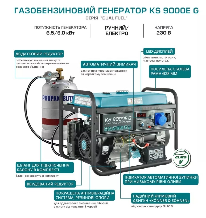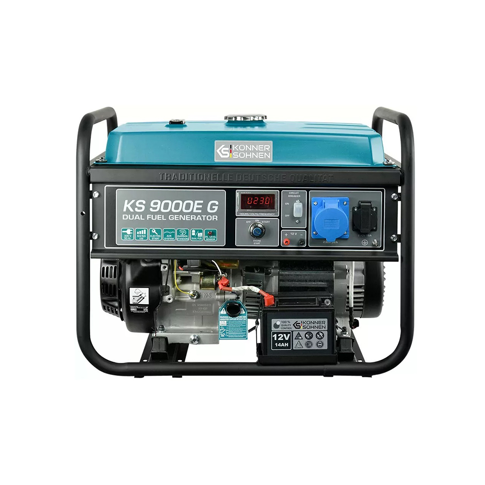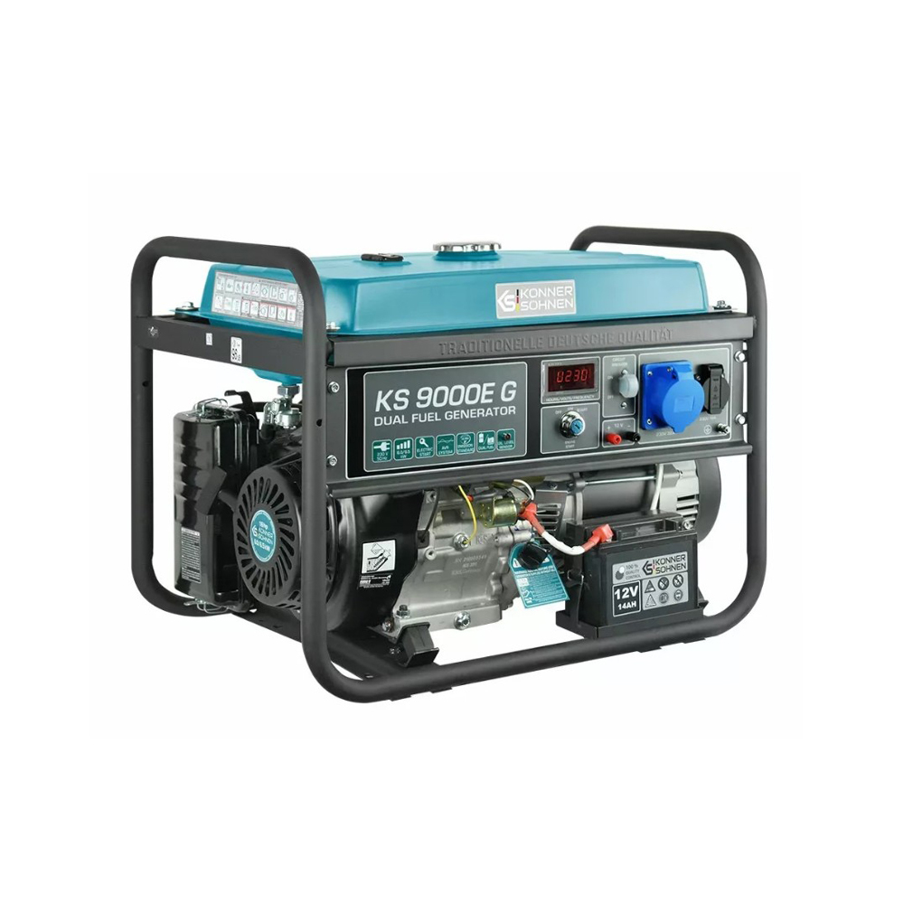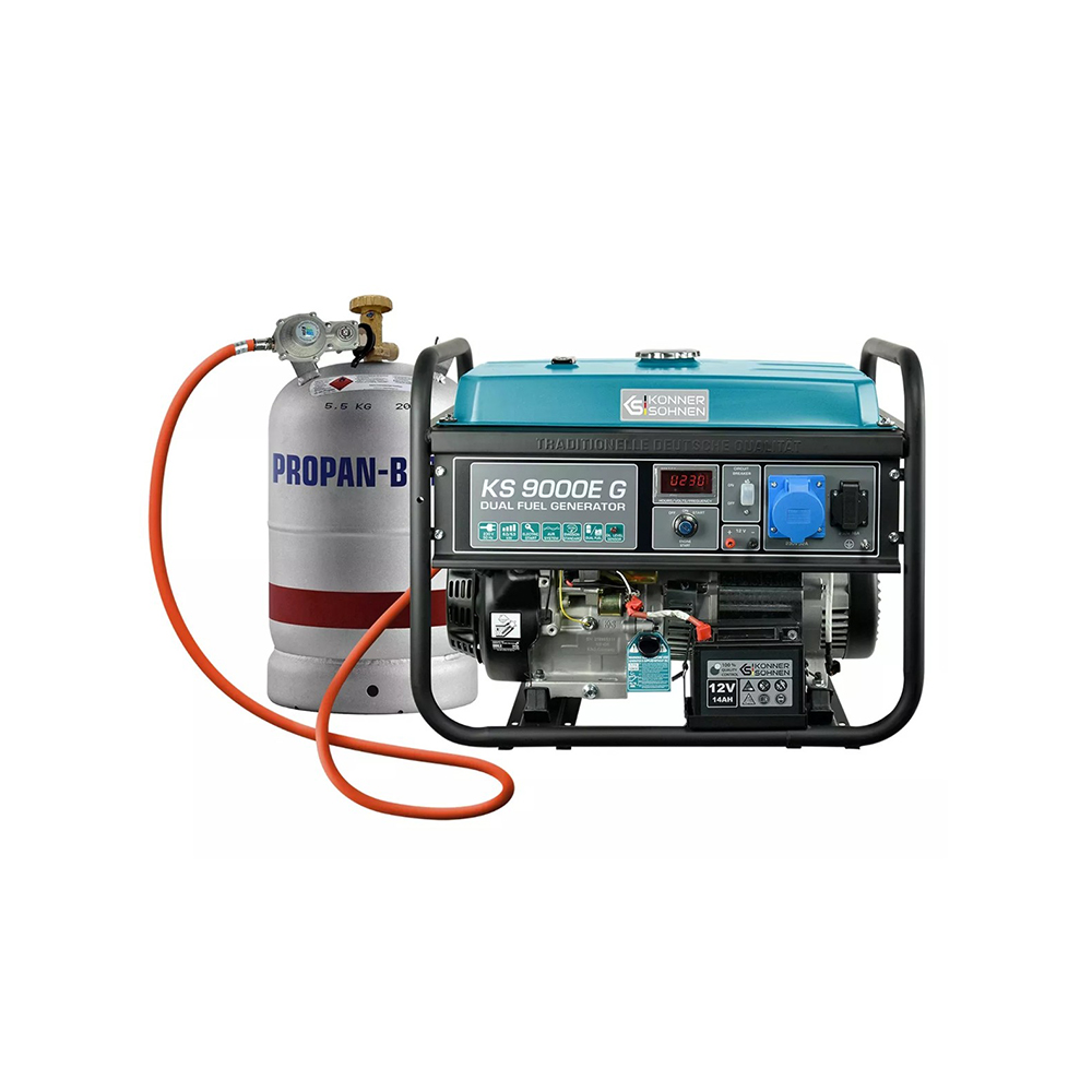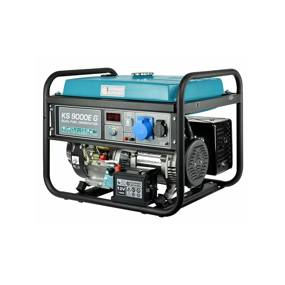 Газобензиновый генератор KS 9000E G немецкой ТМ Könner & Söhnen серии DUAL FUEL — это двухтопливная модель, актуальная поскольку имеет оптимальные характеристики, оснащена как ручным, так и электрозапуском. Мощности генератора достаточно для аварийного питания регулярно используемых электроприборов. Генератор одинаково эффективен как на бензине, так и на газе (пропан-бутан) — генерируемые параметры будут аналогичны.