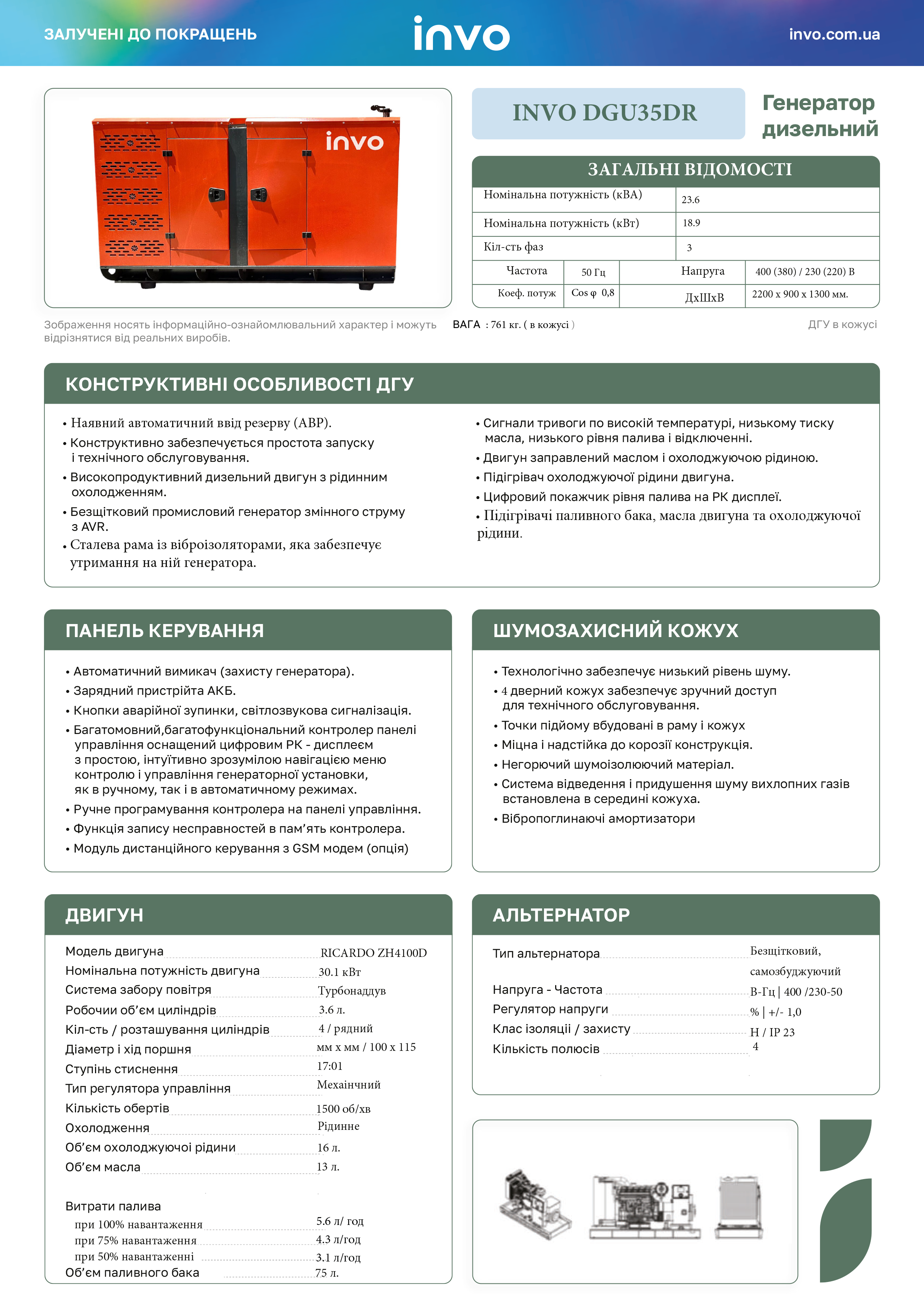 Генератор INVO DGU35DR оснащен дизельным двигателем RICARDO & ZH4100D с четырьмя цилиндрами и механическим регулятором оборотов. Двигатель имеет экономический расход топлива: при 100% нагрузке — 5.6 л/час, при 75% нагрузке — 4.3 л/час, при 50% нагрузке — 3.1 л/час.